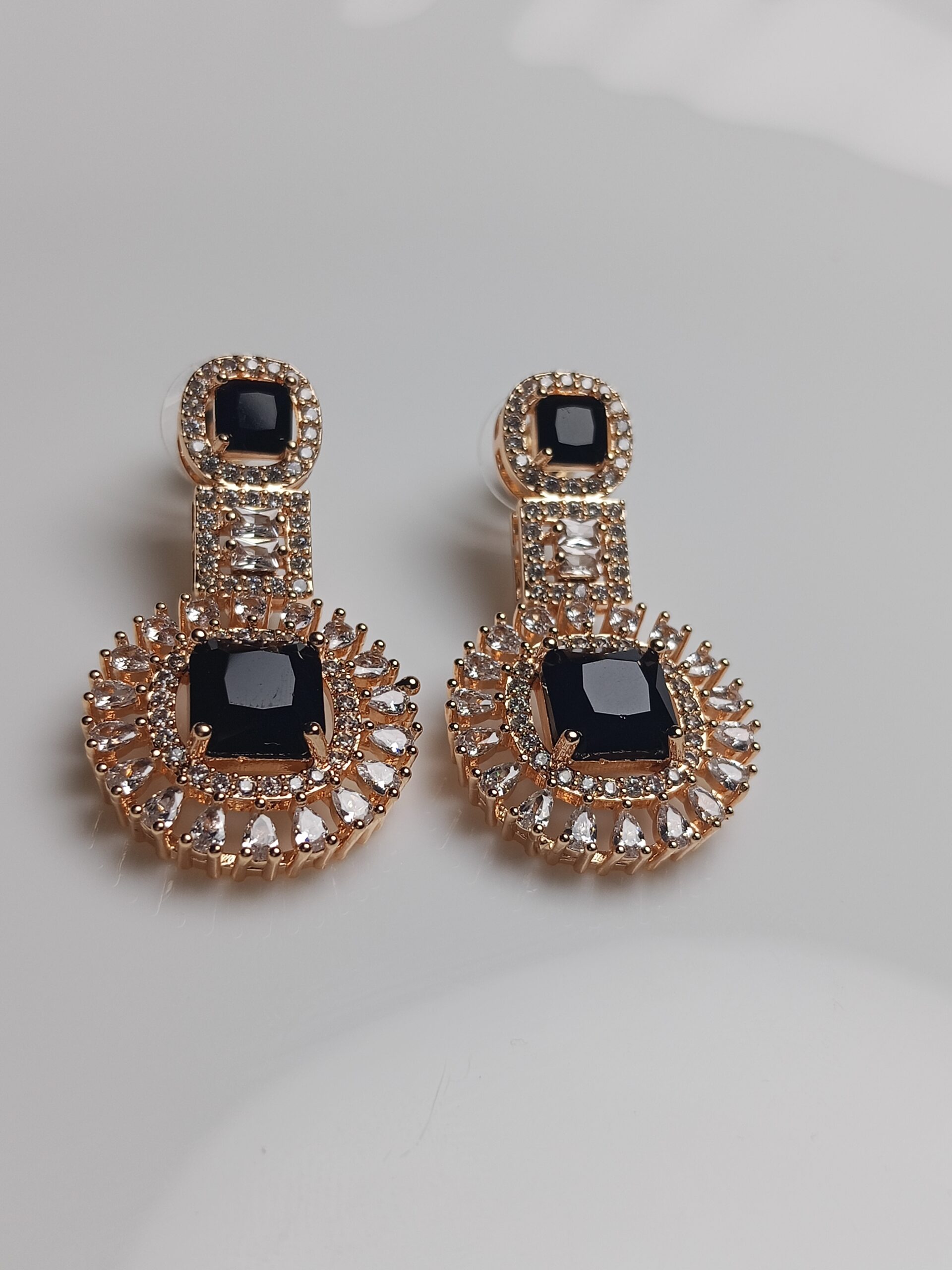 Step out in high style with these dramatic Black Gemstone Drop Earrings. The design features a bold, square-cut black central stone surrounded by a brilliant sunburst pattern of shimmering clear Zircon crystals. Set in a rich gold-tone metal, these vintage-inspired earrings create a striking contrast that is both luxurious and modern. The ornate post, which features an additional black stone and paved Zircon, ensures these pieces stand out as true statement jewelry.